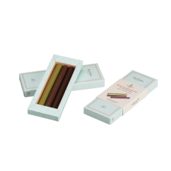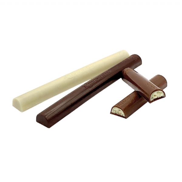 Filled chocolate pencils coated with milk chocolate. Ingredients: cocoa butter, cocoa mass, sugar, skimmed milk powder, almond paste, hazelnut paste, biscuit (wheat flour, sugar, concentrated butter, lactose, milk proteins, salt, barley malt), orange powder, sunflower oil, natural biscuit and orange flavors, black tea, natural flavors, vanilla, emulsifier: soy lecithin. May contain traces of other tree nuts.