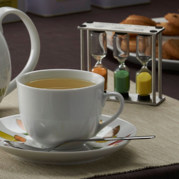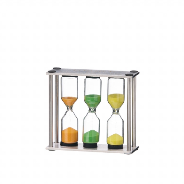 Hourglass tea timer glass and s/steel, ideal to prepare the perfect tea. Light (3 min), medium (4 min), strong (5 min).