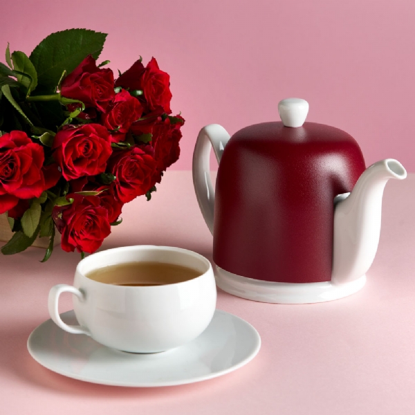 The 4 cup Salam Mineral teapot is in white porcelain, its brushed aluminum cover is burgundy in colour and has a felt lining to keeps the right temperature. Comes with a removable s/steel infuser.